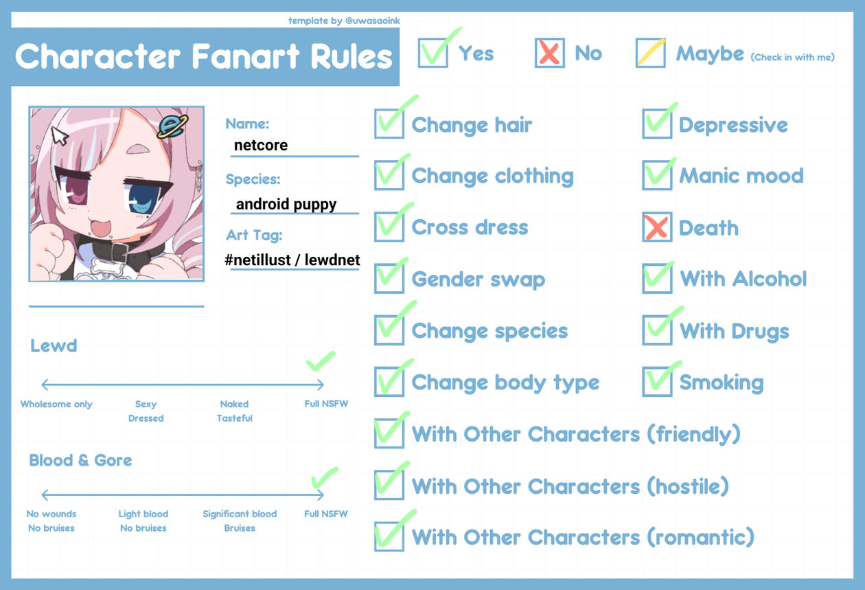 Some more in depth rules:Internet hairpin must ALWAYS be present!!! fanart without it may not be acklowedged as its an integral part of me and my design.My prefered body type is Petite with small/medium breats, like my current Lovesick Nurse Design this is what i like seeing myself as and would make me the happiest! however, you are free to draw me with other body types if you wish!When getting Skebs/COMMS feel free to commission what your heart desires, if it makes me uncomfortable I simply wont interact with it!